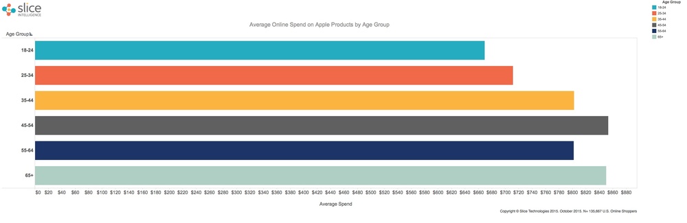 According to new data from Slice Intelligence and its panel of over three million online shoppers, male buyers 65 and older spent the most on Apple products over the past year than any other group, with an average online spend of $976.