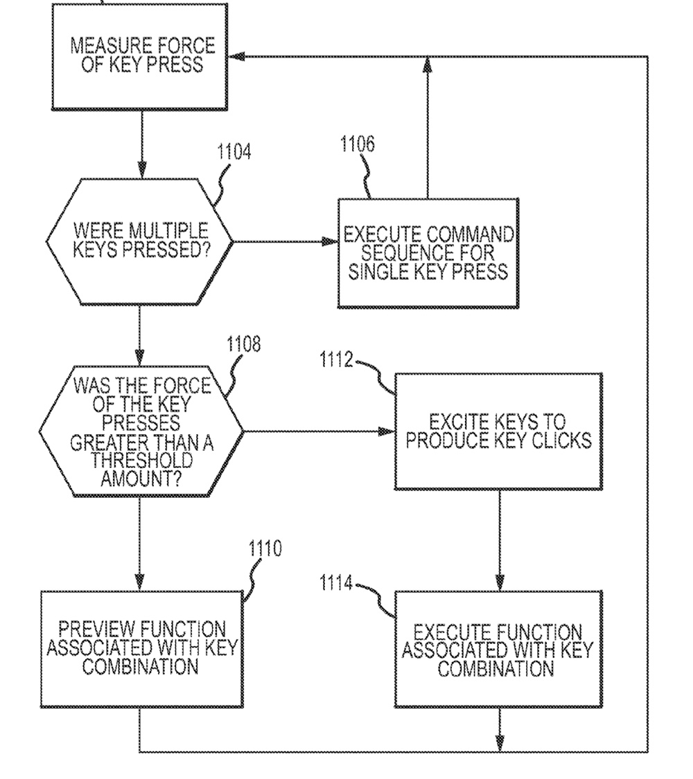When a key of a conventional keyboard is pressed, the key travels a distance in order to close the switch or otherwise make a contact that registers a key press. This makes it difficult to make such keyboards even thinner. Additionally, a key of a conventional keyboard typically is limited to one response that occurs when the switch or other contact is closed. Apple wants a thinner keyboard that can accommodate more than one response in a single key.