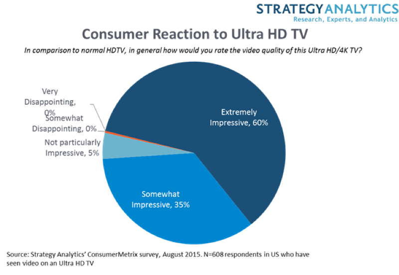 Familiarity with Ultra HD continues to rise. In Strategy Analytics’ August 2015 survey of 2000 US consumers, nearly two thirds of people have heard of Ultra HD, and 30% now claim to have seen Ultra HD TV in a home, retail store or other location. Ratings of Ultra HD video quality remain extremely high, with 95% of people saying they were extremely or somewhat impressed.