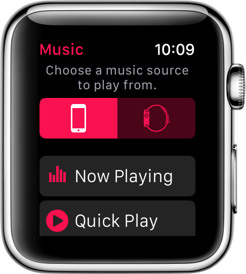 Then Open the Music app, scroll up, then tap your Apple Watch to choose it as the source. Then scroll back down and tap any of these options: