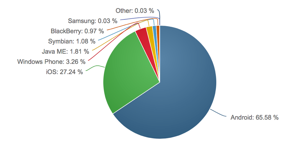 iOS had 27.24% of the mobile operating system market share in June, up from 23.10% in May. This compares to 65.58% for Android, 3.26% for Windows Phone, and 1.81% for Java ME. The all-time high for iOS was in July 2012 with 65.94%