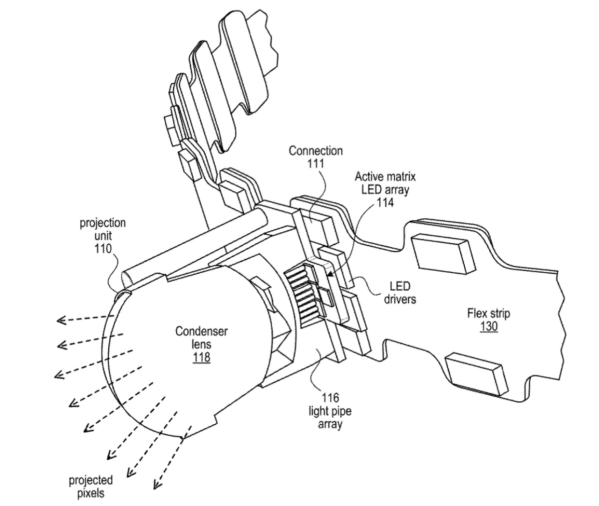Here’s Apple’s abstract of the patent: “A spatial light system may include two or more projection units for emitting light onto surfaces within a room. The system may include a controller and two or more projection units, each module including an LED array, an array of light pipes, and a condenser lens. Two or more projection units may be connected to a flexible strip that provides power and data (e.g., serial data) to the projection units. Two or more flex strips may be connected together. The flex strips provide a serially-connected, flexible modular architecture for spatial light systems that allow the projection units to be conformed to a variety of configurations and shapes.”