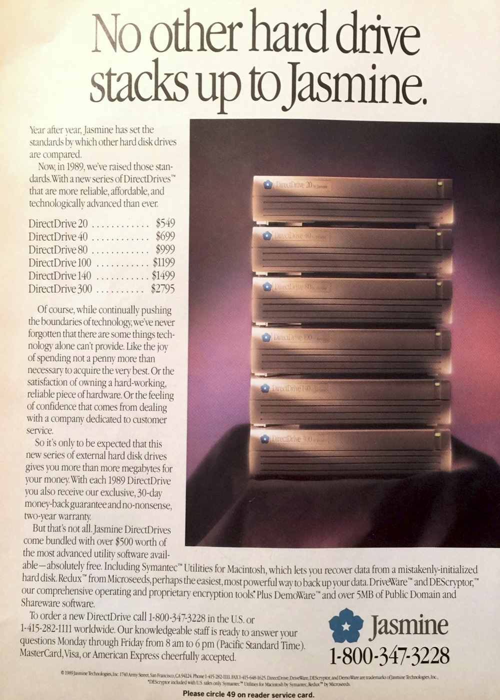 Ahhh, 1989. That was the time when you could spend $549 for a “reliable, affordable and technologically advanced” 20MB hard drive from Jasmine Technologies. This company lasted just five years — 1986 to 1991, and is known as being the first technology company to be based in San Francisco rather than Silicon Valley. It was also a company that was well-known to Mac users of the era as being customer-focused, something that was important when you didn’t have an Apple Store to go to when you needed help.
