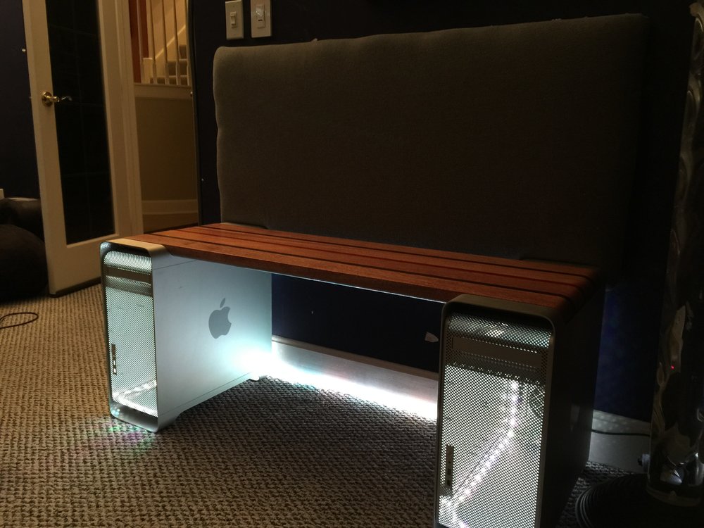 Last, but certainly not least, Katz took two gutted aluminum Mac Pro cases and worked with a pair of contractors to make a beautiful bench. Katz installed LEDs inside it for a nice touch: