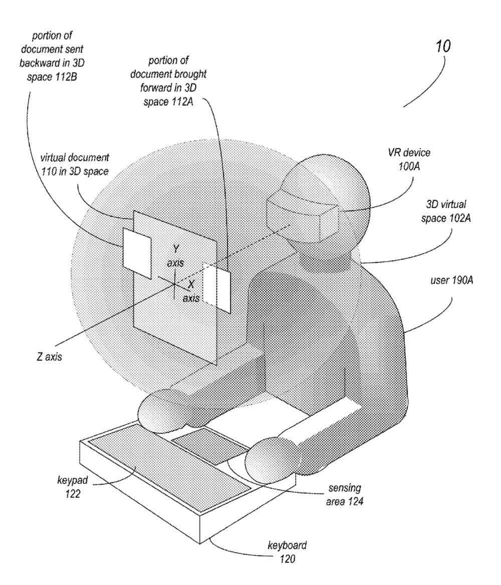 Apple has been granted a patent (number 20180081519) for a 3D document editing system that includes a virtual reality and/or augmented reality device and an input device (e.g., keyboard) that implements sensing technology for detecting gestures by a user.