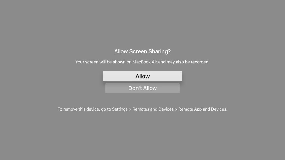 - On the Apple TV, a screen sharing permissions prompt will pop up. Use the Siri Remote and choose Allow.
