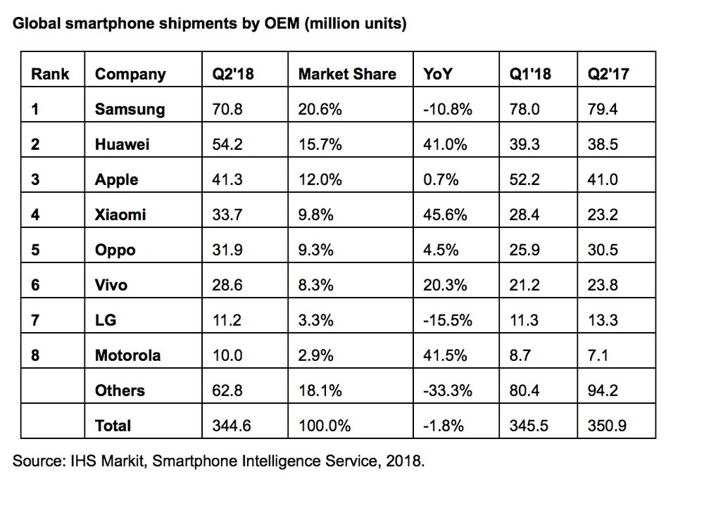 According to the IHS Market research group’s preliminary smartphone data, global smartphone shipments reached 344.6 million units in the second quarter of 2018 – a 1.8% decline year-over-year, and also down slightly from the previous quarter.