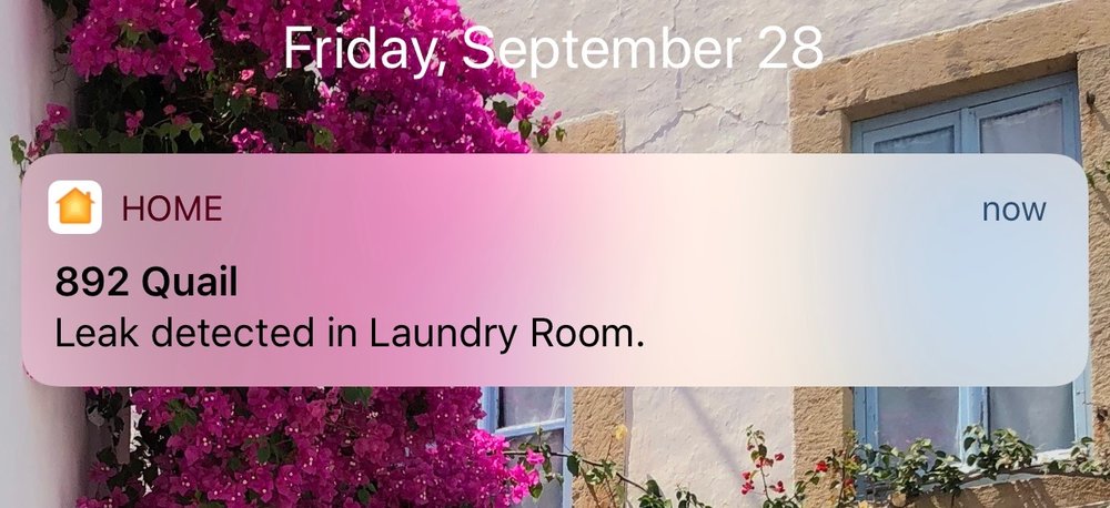 To test the Flood Sensor, I placed it into a sink and turned on the water. As I expected, the sensor immediately started beeping and flashing a red LED, and a notification appeared on my Macs (running Mojave), iPhone and Apple Watch telling me that a leak had been detected in my laundry room: