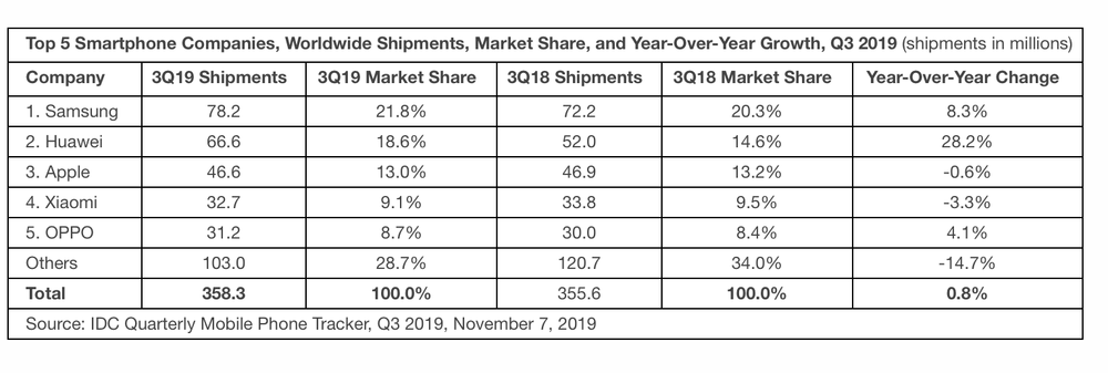 Worldwide smartphone shipments increased 0.8% year over year in the third quarter of 2019, reversing seven quarters of decline. IDC says that, in total, companies shipped a total 358.3 million smartphones during the quarter, which was up 8.1% from the previous quarter and enough to return the industry to positive growth.
