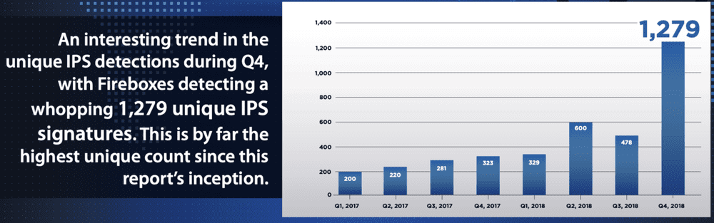Network attacks rise after historic lows in mid-2018 – Network attacks rose 46 percent by volume and 167% in terms of unique signature hits in Q4 compared to Q3. This follows a trend seen in previous years with attacks ramping up during the holiday season.