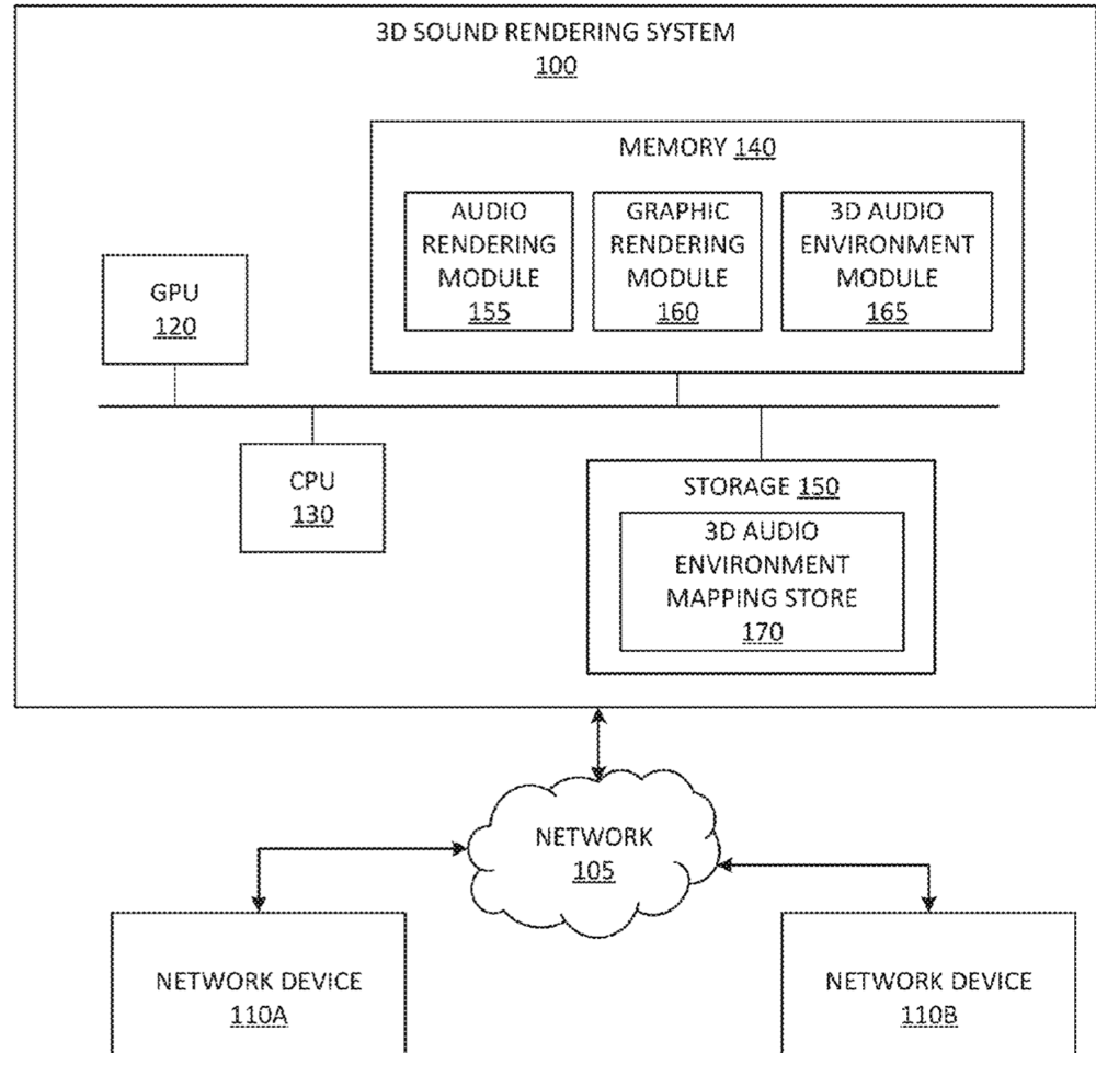 Here’s Apple’s summary of the patent: “Simulating a 3D audio environment, including receiving a visual representation of an object at a location in a scene, wherein the location represents a point in 3D space, receiving a sound element, and binding the sound element to the visual representation of the object such that a characteristic of the sound element is dynamically modified coincident with a change in location in the scene of the visual representation of the object in 3D space.”
