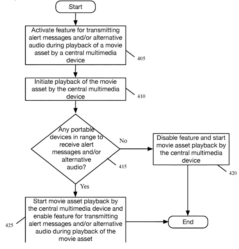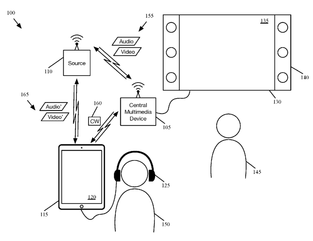 Apple’s idea: video content would be streamed by a central multimedia device for simultaneous playback on a given playback device (e.g., a television set having a display screen and built-in loudspeakers) and on a portable playback device (a Mac, iPhone, or iPad) of a particular audience member. The latter would be adjusted to suit the different needs of the particular audience member watching or listening using the portable device.