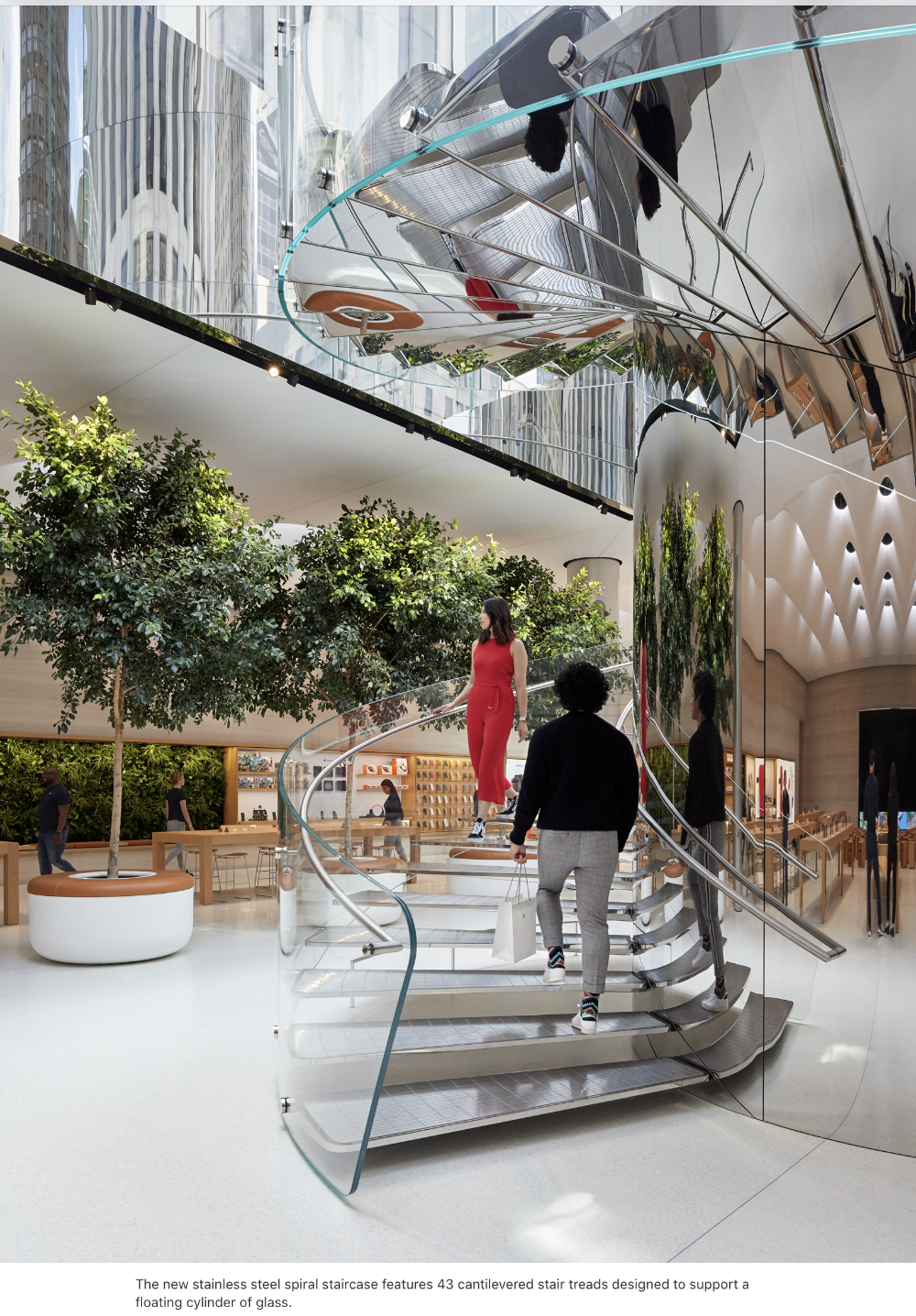 The staircase has 43 cantilevered stair treads that support a floating cylinder of glass. Above is a back-lit, cloud-like ceiling made from curved fabric that combines artificial and natural light to match the real-time tones of sunlight throughout the day.
