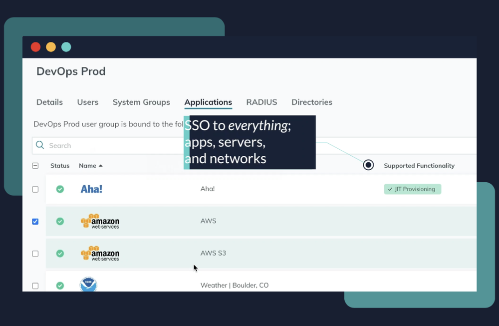 Identity Trust: JumpCloud’s core directory securely manages an organization’s user identities including all credential control and revocation, two factor verification and contextual data to ensure appropriate levels of permission when accessing resources.