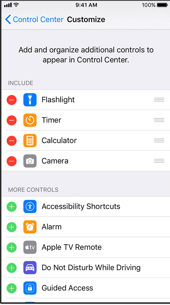 - To add controls, tap the “plus” sign. To remove controls, tap the “minus” sign, then tap Remove.